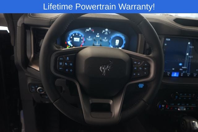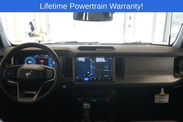 Bronco Outer Banks Advanced is nicely equipped with Black Appearance Package (Black Molded-In-Color Door Handles, Black Molded-In-Color Fender Flares, Black Molded-In-Color Sideview Mirror Caps, and Black-Painted Molded-In-Color Grille), Equipment Group 314A Lux Package (360-Degree Camera, Adaptive Cruise Control, Evasive Steering Assist, Front Parking Sensors, Information on Demand Panel, Radio: B&O Sound System by Bang & Olufsen, Sideview Mirrors, and Universal Garage Door Opener), 18 Bright Machined Aluminum Wheels, 3.73 Axle Ratio, 4-Wheel Disc Brakes, 7 Speakers, ABS brakes, Air Conditioning, Alloy wheels, AM/FM radio: SiriusXM with 360L, AM/FM Stereo, Auto High-beam Headlights, Auto-dimming Rear-View mirror, Automatic temperature control, Brake assist, Compass, Connected Navigation, Delay-off headlights, Driver door bin, Driver vanity mirror, Dual front impact airbags, Dual front side impact airbags, Electronic Stability Control, Emergency communication system: 911 Assist, Exterior Parking Camera Rear, Front & Rear Floor Liners w/o Carpet Floor Mats, Front anti-roll bar, Front Bucket Seats, Front Center Armrest, Front dual zone A/C, Front fog lights, Front License Plate Bracket, Front reading lights, Front wheel independent suspension, Fully automatic headlights, Hard Top Sound Deadening Headliner, Heated door mirrors, Heated front seats, Heated Leather-Trimmed/Vinyl Bucket Seats, Heated steering wheel, Illuminated entry, Integrated roll-over protection, Internet access capable: FordPass Connect, Leather Shift Knob, Low tire pressure warning, Navigation system: Connected Navigation, Occupant sensing airbag, Outside temperature display, Overhead airbag, Overhead console, Panic alarm, Passenger door bin, Passenger vanity mirror, Power door mirrors, Power driver seat, Power passenger seat, Power steering, Power windows, Radio data system, Rear seat center armrest, Rear-Window Defroster & Washer, Remote keyless entry, Security system, Shadow Black-Painted Hard Top, SiriusXM w/360L, Speed control, Split folding rear seat, Steering wheel mounted audio controls, SYNC 4, Tachometer, Telescoping steering wheel, Tilt steering wheel, Traction control, Trip computer, Variably intermittent wipers, and Voltmeter.
