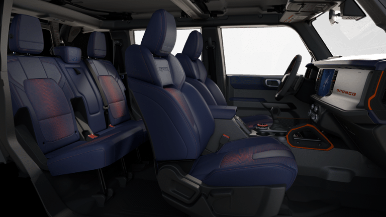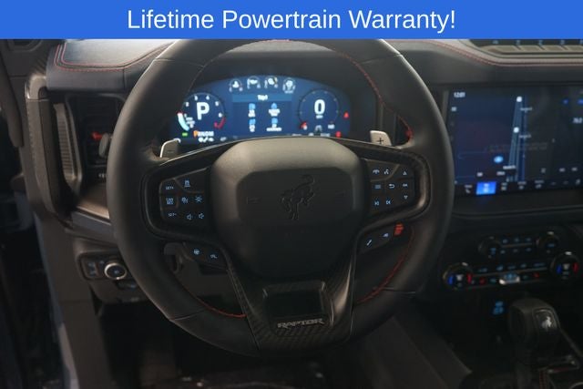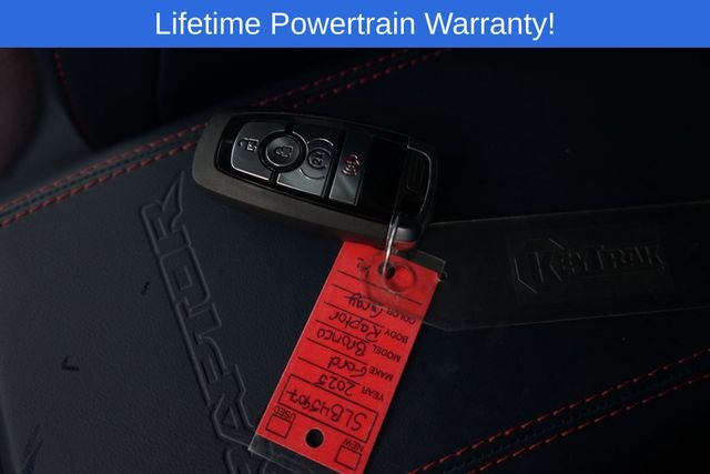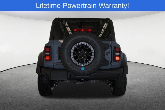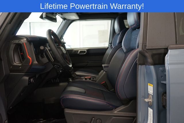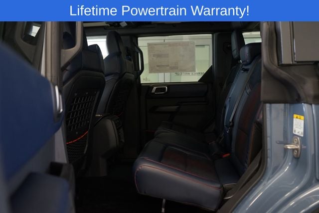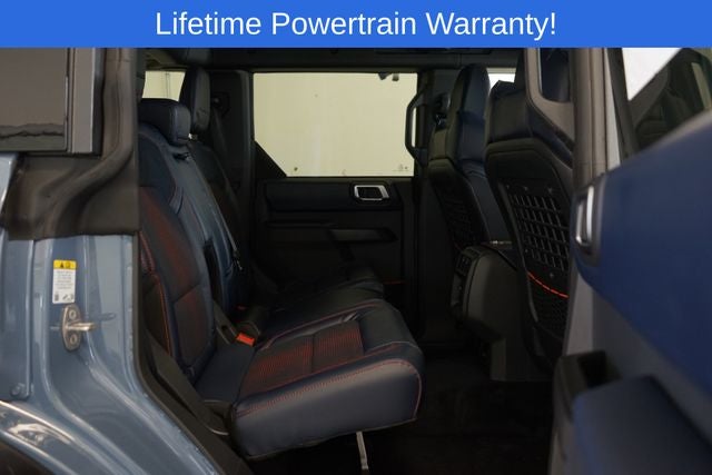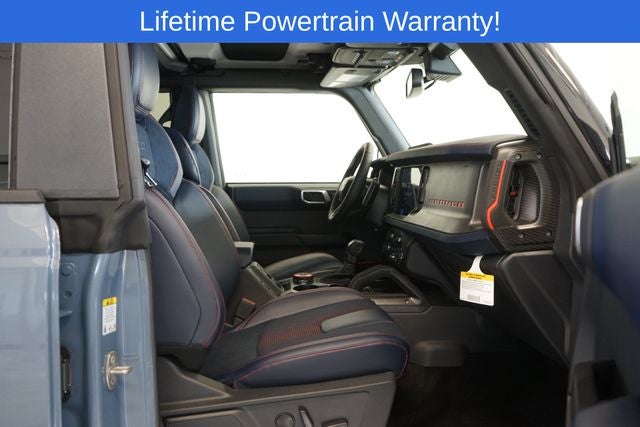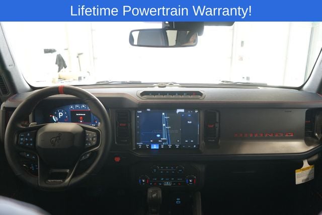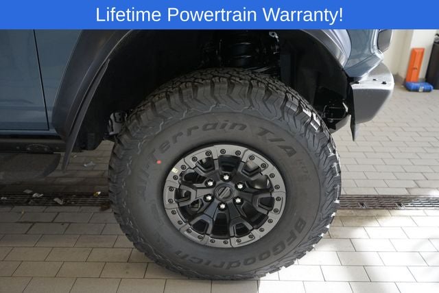 Bronco Raptor is nicely equipped with 12 Speakers, 4-Wheel Disc Brakes, ABS brakes, Air Conditioning, Alloy wheels, AM/FM radio: SiriusXM with 360L, Auto High-beam Headlights, Auto-dimming Rear-View mirror, Automatic temperature control, Brake assist, Compass, Connected Navigation, Convertible HardTop, Convertible roof lining, Delay-off headlights, Driver door bin, Driver vanity mirror, Dual front impact airbags, Dual front side impact airbags, Electronic Stability Control, Emergency communication system: 911 Assist, Exterior Parking Camera Rear, Front anti-roll bar, Front Bucket Seats, Front Center Armrest, Front dual zone A/C, Front fog lights, Front reading lights, Front wheel independent suspension, Fully automatic headlights, Garage door transmitter, Glass rear window, Heated door mirrors, Heated front seats, Heated steering wheel, Illuminated entry, Integrated roll-over protection, Internet access capable: FordPass Connect, Leather Shift Knob, Low tire pressure warning, Marine Grade Vinyl Bucket Seats, Navigation system: Connected Navigation, Occupant sensing airbag, Outside temperature display, Overhead airbag, Overhead console, Panic alarm, Passenger door bin, Passenger vanity mirror, Power door mirrors, Power steering, Power windows, Radio data system, Radio: B&O Sound System by Bang & Olufsen, Rear anti-roll bar, Rear seat center armrest, Rear window defroster, Rear window wiper, Remote keyless entry, Security system, SiriusXM w/360L, Speed control, Split folding rear seat, Steering wheel mounted audio controls, SYNC 4, Tachometer, Telescoping steering wheel, Tilt steering wheel, Traction control, Trip computer, Turn signal indicator mirrors, Variably intermittent wipers, Voltmeter, and Wheels: 17 Black High Gloss-Painted Aluminum.