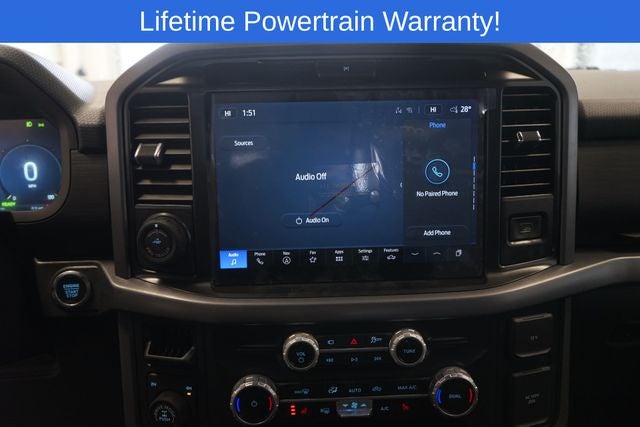 F-150 XLT is nicely equipped with Equipment Group 302A Mid (360 Degree Camera, 400W Cab & Bed Outlets, 6 Angular Bright Anodized Step Bar, Adaptive Cruise Control w/Stop & Go, Auto-Dimming Rear-View Mirror, Black Painted Grille w/Chrome Center Bar, Chrome Door & Tailgate Handles, Chrome Single-Tip Exhaust, Cloth 40/Console/40 Front Seats, Connected Navigation, Driver State Detection, Dual-Zone Electronic Automatic Temperature Control, Evasive Steering Assist, Ford Co-Pilot360 Assist 2.0, Front Parking Sensors, Heated Front Seats, Intelligent Access w/Push Button Start, Power Glass Heated Sideview Mirrors, Power-Sliding Rear Window, Remote Start System w/Remote Tailgate Release, Towing Technology, and Wrapped Steering Wheel), Mobile Office Package (Console Worksurface and Partitioned Lockable Rear Storage), 4-Wheel Disc Brakes, 6 Speakers, ABS brakes, Air Conditioning, Alloy wheels, AM/FM radio: SiriusXM with 360L, Auto High-beam Headlights, BlueCruise (Equipment + 1-Year Plan), Brake assist, Bumpers: chrome, Chrome wheels, Cloth 40/20/40 Front Seat, Compass, Delay-off headlights, Driver door bin, Driver vanity mirror, Dual front impact airbags, Dual front side impact airbags, Electronic Stability Control, Emergency communication system: SYNC 4 911 Assist, Front anti-roll bar, Front Center Armrest, Front fog lights, Front License Plate Bracket, Front reading lights, Front wheel independent suspension, Fully automatic headlights, Heated door mirrors, Illuminated entry, Internet access capable: FordPass Connect 5G, Low tire pressure warning, Occupant sensing airbag, Outside temperature display, Overhead airbag, Overhead console, Panic alarm, Passenger door bin, Passenger vanity mirror, Power door mirrors, Power steering, Power windows, Radio data system, Radio: AM/FM Stereo w/SiriusXM 360L, Rear Parking Sensors, Rear reading lights, Rear step bumper, Rear window defroster, Remote keyless entry, Security system, Speed control, Split folding rear seat, Steering wheel mounted audio controls, SYNC 4 w/Enhanced Voice Recognition, Tachometer, Telescoping steering wheel, Tilt steering wheel, Tough Bed Spray-In Bedliner, Traction control, Tray Style Floor Liner w/Carpet Mats, Trip computer, Variably intermittent wipers, Voltmeter, and Wheels: 18 Chrome-Like PVD.