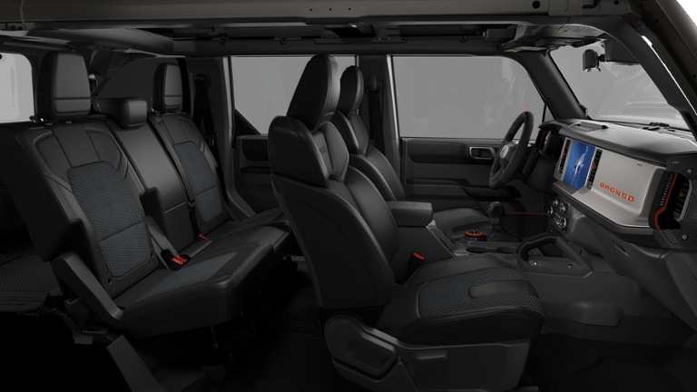 Bronco Raptor is nicely equipped with Ford Connectivity Package (1-Year Included), 12 Speakers, 4-Wheel Disc Brakes, ABS brakes, Air Conditioning, Alloy wheels, AM/FM radio: SiriusXM with 360L, Auto High-beam Headlights, Auto-dimming Rear-View mirror, Automatic temperature control, Brake assist, Compass, Connected Navigation, Convertible HardTop, Convertible roof lining, Delay-off headlights, Driver door bin, Driver vanity mirror, Dual front impact airbags, Dual front side impact airbags, Electronic Stability Control, Emergency communication system: 911 Assist, Exterior Parking Camera Rear, Front anti-roll bar, Front Bucket Seats, Front Center Armrest, Front dual zone A/C, Front fog lights, Front reading lights, Front wheel independent suspension, Fully automatic headlights, Glass rear window, Heated door mirrors, Heated front seats, Heated steering wheel, Illuminated entry, Integrated roll-over protection, Leather Shift Knob, Low tire pressure warning, Marine Grade Vinyl Bucket Seats, Navigation system: Connected Navigation, Occupant sensing airbag, Outside temperature display, Overhead airbag, Overhead console, Panic alarm, Passenger door bin, Passenger vanity mirror, Power door mirrors, Power steering, Power windows, Radio data system, Rear anti-roll bar, Rear seat center armrest, Rear window defroster, Rear window wiper, Remote keyless entry, Security system, SiriusXM with 360L, Speed control, Split folding rear seat, Steering wheel mounted audio controls, SYNC 4, Tachometer, Telescoping steering wheel, Tilt steering wheel, Traction control, Trip computer, Turn signal indicator mirrors, Variably intermittent wipers, Voltmeter, and Wheels: 17 Black High Gloss-Painted Aluminum.