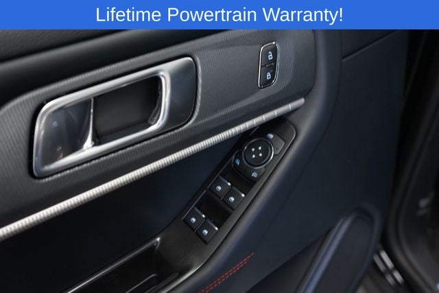 Explorer ST-Line is nicely equipped with 10 Speakers, 3rd row seats: bench, 4-Wheel Disc Brakes, ABS brakes, Air Conditioning, Alloy wheels, AM/FM radio: SiriusXM with 360L, Apple CarPlay/Android Auto, Auto High-beam Headlights, Automatic temperature control, Brake assist, Bumpers: body-color, Compass, Delay-off headlights, Driver door bin, Driver vanity mirror, Dual front impact airbags, Dual front side impact airbags, Electronic Stability Control, Emergency communication system: 911 Assist, Exterior Parking Camera Rear, Four wheel independent suspension, Front anti-roll bar, Front Bucket Seats, Front Center Armrest, Front dual zone A/C, Front fog lights, Front reading lights, Fully automatic headlights, Garage door transmitter, Heated door mirrors, Heated front seats, Heated steering wheel, Heated Unique Cloth Captain's Chairs, Illuminated entry, Knee airbag, Leather steering wheel, Low tire pressure warning, Navigation System, Occupant sensing airbag, Outside temperature display, Overhead airbag, Overhead console, Panic alarm, Passenger door bin, Passenger vanity mirror, Power door mirrors, Power driver seat, Power Liftgate, Power passenger seat, Power steering, Power windows, Radio: B&O Sound System by Bang and Olufsen, Rear air conditioning, Rear anti-roll bar, Rear reading lights, Rear window defroster, Rear window wiper, Remote keyless entry, Security system, Speed control, Speed-sensing steering, Speed-Sensitive Wipers, Split folding rear seat, Spoiler, Steering wheel mounted audio controls, Tachometer, Telescoping steering wheel, Tilt steering wheel, Traction control, Trip computer, Variably intermittent wipers, and Wheels: 20 Ebony-Painted Machined Aluminum.