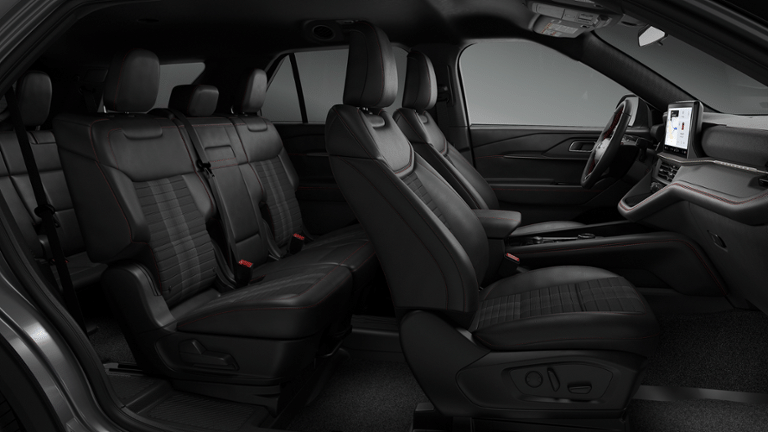 Explorer ST-Line is nicely equipped with 10 Speakers, 3rd row seats: bench, 4-Wheel Disc Brakes, ABS brakes, Air Conditioning, Alloy wheels, AM/FM radio: SiriusXM with 360L, Apple CarPlay/Android Auto, Auto High-beam Headlights, Automatic temperature control, Brake assist, Bumpers: body-color, Compass, Delay-off headlights, Driver door bin, Driver vanity mirror, Dual front impact airbags, Dual front side impact airbags, Electronic Stability Control, Emergency communication system: 911 Assist, Exterior Parking Camera Rear, Four wheel independent suspension, Front anti-roll bar, Front Bucket Seats, Front Center Armrest, Front dual zone A/C, Front fog lights, Front reading lights, Fully automatic headlights, Garage door transmitter, Heated door mirrors, Heated front seats, Heated steering wheel, Heated Unique Cloth Captain's Chairs, Illuminated entry, Knee airbag, Leather steering wheel, Low tire pressure warning, Navigation System, Occupant sensing airbag, Outside temperature display, Overhead airbag, Overhead console, Panic alarm, Passenger door bin, Passenger vanity mirror, Power door mirrors, Power driver seat, Power Liftgate, Power passenger seat, Power steering, Power windows, Radio: B&O Sound System by Bang and Olufsen, Rear air conditioning, Rear anti-roll bar, Rear reading lights, Rear window defroster, Rear window wiper, Remote keyless entry, Security system, Speed control, Speed-sensing steering, Speed-Sensitive Wipers, Split folding rear seat, Spoiler, Steering wheel mounted audio controls, Tachometer, Telescoping steering wheel, Tilt steering wheel, Traction control, Trip computer, Variably intermittent wipers, and Wheels: 20 Ebony-Painted Machined Aluminum.