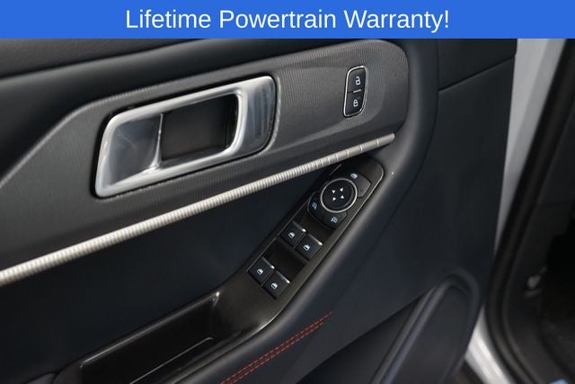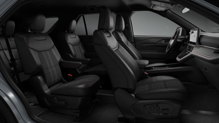 Explorer ST-Line is nicely equipped with Equipment Group 300A Standard Package (Heated Unique Cloth Captain's Chairs, Radio: B&O Sound System by Bang and Olufsen, and Wheels: 20 Ebony-Painted Machined Aluminum), 10 Speakers, 2nd Row Captain's Chairs w/E-Z Entry and Armrest, 3rd row seats: bench, 4-Wheel Disc Brakes, ABS brakes, Air Conditioning, Alloy wheels, AM/FM radio: SiriusXM with 360L, Apple CarPlay/Android Auto, Auto High-beam Headlights, Automatic temperature control, BlueCruise (equipment + 1-Year + 90-Day Plan), BlueCruise Hardware, Brake assist, Bumpers: body-color, Compass, Delay-off headlights, Driver door bin, Driver vanity mirror, Dual front impact airbags, Dual front side impact airbags, Electronic Stability Control, Emergency communication system: 911 Assist, Exterior Parking Camera Rear, Four wheel independent suspension, Front and 2nd Rows Floor Liners with Carper Floor Mats, Front anti-roll bar, Front Bucket Seats, Front Center Armrest, Front dual zone A/C, Front fog lights, Front License Plate Bracket, Front reading lights, Fully automatic headlights, Garage door transmitter, Heated door mirrors, Heated front seats, Heated steering wheel, Illuminated entry, Knee airbag, Leather steering wheel, Low tire pressure warning, Navigation System, Occupant sensing airbag, Outside temperature display, Overhead airbag, Overhead console, Panic alarm, Passenger door bin, Passenger vanity mirror, Power door mirrors, Power driver seat, Power Liftgate, Power passenger seat, Power steering, Power windows, Rear air conditioning, Rear anti-roll bar, Rear reading lights, Rear window defroster, Rear window wiper, Remote keyless entry, Security system, Speed control, Speed-sensing steering, Speed-Sensitive Wipers, Split folding rear seat, Spoiler, Steering wheel mounted audio controls, Tachometer, Telescoping steering wheel, Tilt steering wheel, Traction control, Trip computer, and Variably intermittent wipers.