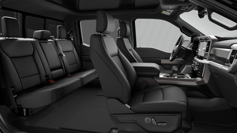 F-150 Lariat is nicely equipped with Ford Connectivity Package (1-Year Included), Internet access capable: 5G Modem - Ford Connectivity Package, 3.31 Axle Ratio, 4-Wheel Disc Brakes, 8 Speakers, ABS brakes, Air Conditioning, Alloy wheels, AM/FM radio: SiriusXM with 360L, Auto High-beam Headlights, Auto-dimming door mirrors, Auto-dimming Rear-View mirror, Automatic temperature control, Brake assist, Bumpers: chrome, Chrome wheels, Compass, Delay-off headlights, Driver door bin, Driver vanity mirror, Dual front impact airbags, Dual front side impact airbags, Electronic Stability Control, Emergency communication system: SYNC 4 911 Assist, Front anti-roll bar, Front Bucket Seats, Front Center Armrest, Front dual zone A/C, Front fog lights, Front reading lights, Front wheel independent suspension, Fully automatic headlights, Garage door transmitter, Heated door mirrors, Heated front seats, Heated steering wheel, Illuminated entry, Low tire pressure warning, Memory seat, Navigation system: Connected Navigation, Occupant sensing airbag, Outside temperature display, Overhead airbag, Overhead console, Panic alarm, Passenger door bin, Passenger vanity mirror, Power door mirrors, Power driver seat, Power passenger seat, Power steering, Power windows, Radio data system, Radio: B&O Sound System by Bang and Olufsen, Rain sensing wipers, Rear reading lights, Rear seat center armrest, Rear step bumper, Rear window defroster, Remote keyless entry, Security system, Speed control, Split folding rear seat, Steering wheel mounted audio controls, SYNC 4 with Enhanced Voice Recognition, Tachometer, Telescoping steering wheel, Tilt steering wheel, Traction control, Trip computer, Turn signal indicator mirrors, Variably intermittent wipers, Ventilated front seats, and Wheels: 18 Chrome-Like PVD.