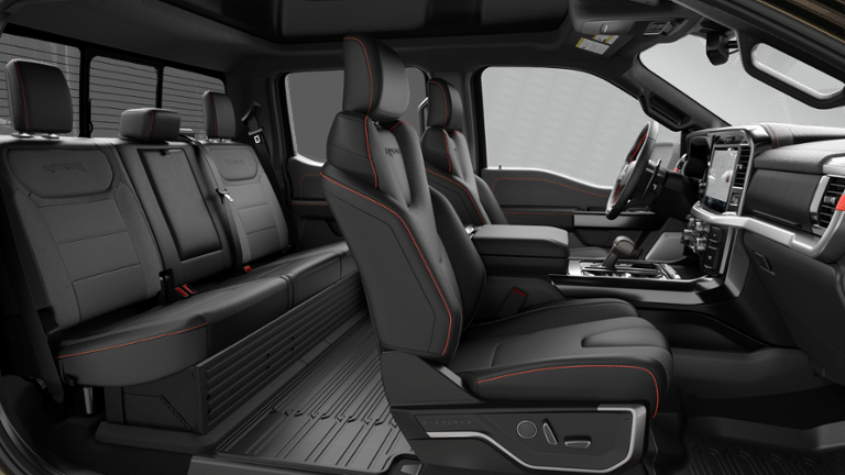 F-150 Raptor is nicely equipped with Ford Connectivity Package (1-Year Included), Internet access capable: 5G Modem - Ford Connectivity Package, 14 Speakers, 17 Cast Aluminum Wheels, 4-Wheel Disc Brakes, ABS brakes, Adjustable pedals, Air Conditioning, Alloy wheels, AM/FM radio: SiriusXM with 360L, Auto High-beam Headlights, Auto tilt-away steering wheel, Auto-dimming door mirrors, Auto-dimming Rear-View mirror, Automatic temperature control, Brake assist, Bumpers: body-color, Compass, Delay-off headlights, Driver door bin, Driver vanity mirror, Dual front impact airbags, Dual front side impact airbags, Electronic Locking with 4.10 Axle Ratio, Electronic Stability Control, Emergency communication system: SYNC 4 911 Assist, Front anti-roll bar, Front Bucket Seats, Front Center Armrest, Front dual zone A/C, Front fog lights, Front reading lights, Front wheel independent suspension, Fully automatic headlights, Garage door transmitter, Heated door mirrors, Heated front seats, Heated rear seats, Heated steering wheel, Illuminated entry, Lane Departure Warning System, Leather steering wheel, Leather Trimmed Seats, Low tire pressure warning, Memory seat, Navigation system: Connected Navigation, Occupant sensing airbag, Outside temperature display, Overhead airbag, Overhead console, Panic alarm, Passenger door bin, Passenger vanity mirror, Pedal memory, Power door mirrors, Power driver seat, Power passenger seat, Power steering, Power windows, Radio data system, Radio: B&O Unleashed Sound System by Bang & Olufsen, Rain sensing wipers, Rear reading lights, Rear step bumper, Rear window defroster, Remote keyless entry, Security system, Speed control, Speed-sensing steering, Split folding rear seat, Steering wheel memory, Steering wheel mounted audio controls, SYNC 4 with Enhanced Voice Recognition, Tachometer, Telescoping steering wheel, Tilt steering wheel, Traction control, Trip computer, Turn signal indicator mirrors, Variably intermittent wipers, and Ventilated front seats.