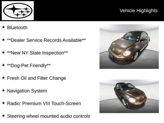 Under the hood, this Beetle is powered by a 2.5L, 170-horsepower engine mated to a smooth-shifting 6-speed automatic transmission. With an EPA-estimated 22 mpg in the city and 29 mpg on the highway, this Beetle offers a compelling blend of performance and efficiency.