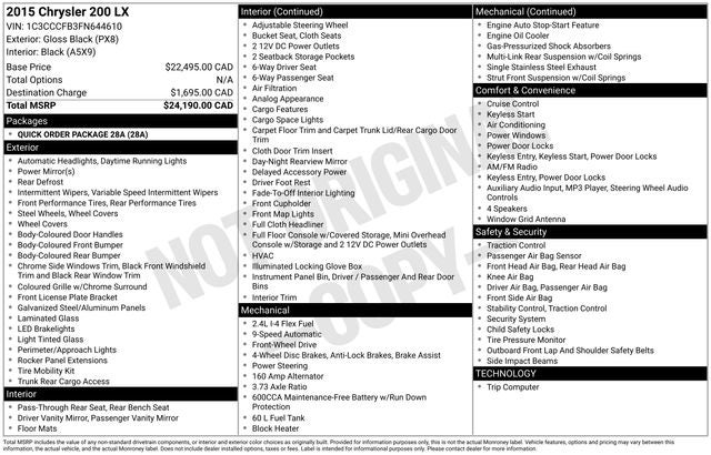 Black Clearcoat 2015 Chrysler 200 LX 4D Sedan FWD 9-Speed 948TE Automatic 2.4L I4 MultiAir 23/36 City/Highway MPG
