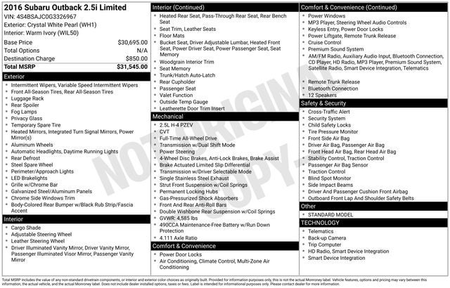 This 2016 Subaru Outback 2.5i Limited is a versatile and well-equipped SUV that offers an exceptional driving experience. With its spacious interior, advanced technology features, and impressive fuel efficiency, this Outback is the perfect companion for your next adventure.