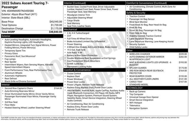 With a stunning Blue exterior and a wealth of premium features, this 2022 Subaru Ascent Touring is a true standout in the midsize SUV segment. Experience the ultimate in family-friendly versatility, cutting-edge technology, and uncompromising Subaru quality. Visit our showroom today and let us demonstrate why the Ascent Touring is the perfect addition to your lifestyle.