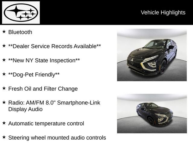 Boasting an impressive fuel efficiency of 25 MPG in the city and 26 MPG on the highway, the Eclipse Cross LE balances power and efficiency, making it an exceptional choice for your daily commute or weekend adventures. The sleek and modern exterior, complemented by the Black color, exudes a bold and sophisticated presence that is sure to turn heads wherever you go.