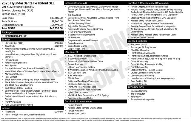 Ultimate Red 2025 Hyundai Santa Fe Hybrid SEL 4D Sport Utility AWD 6-Speed Automatic with Shiftronic I4 35/34 City/Highway MPG